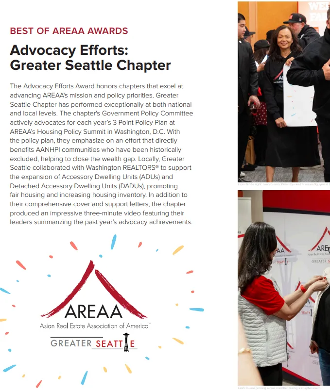 Partner with AREAA Greater Seattle to align your brand with a mission-driven organization empowering Asian American, Native Hawaiian, and Pacific Islander communities. Gain access to 19,000+ real estate professionals nationwide, 25,000+ monthly website visitors, and 100,000+ social media followers while supporting equitable housing and financial literacy initiatives.